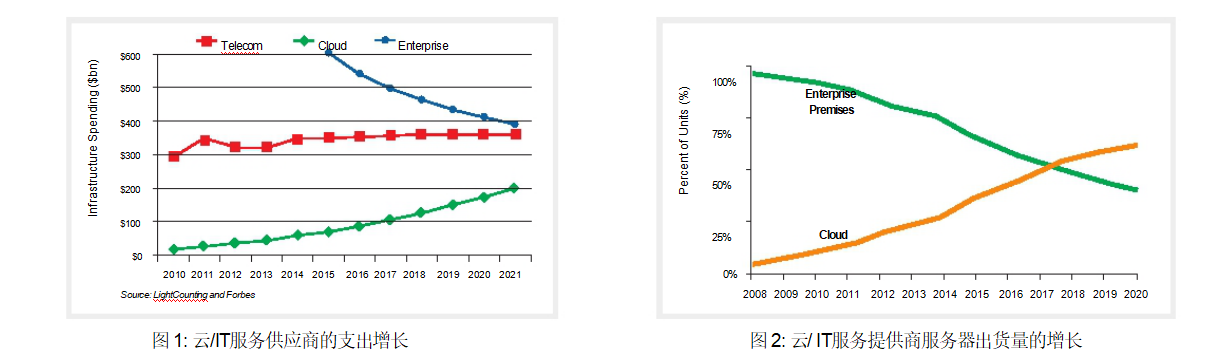 如今,在這些行業(yè)中,這些不同類型的數(shù)據(jù)中心如何投資于其基礎(chǔ)設(shè)施正在發(fā)生重大轉(zhuǎn)變。LightCounting和福布斯的報(bào)告稱,云/ IT服務(wù)提供商的投資在上升,企業(yè)IT的投資在下降,如圖1所示。