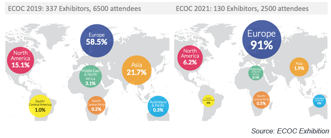 如下圖所示,大多數(shù)美國和日本的大型公司沒有參加或參展ECOC2021,這讓歐洲公司以及一些外國供應(yīng)商在歐洲的銷售和營銷團(tuán)隊(duì)的知名度得以提高。光迅和海思是此次展會(huì)上為數(shù)不多的外國參展商之一,由他們的當(dāng)?shù)貓F(tuán)隊(duì)做代表。大型參展商的缺席,讓較小的供應(yīng)商獲得了更多的知名度,其中包括一些不得不跨境參加的供應(yīng)商。