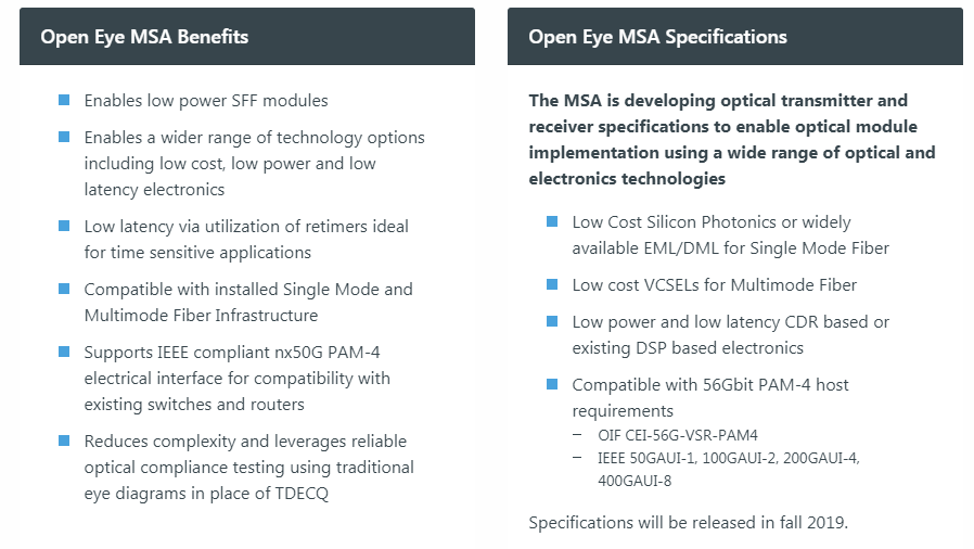 ICCSZ訊(編譯:Aiur) 由硅工藝技術(shù)專家MACOM和Semtech領(lǐng)銜成立的開(kāi)放眼圖聯(lián)盟(The Open Eye Consortium,OEC)于近期建立了一個(gè)多源協(xié)議(MSA),目標(biāo)是標(biāo)準(zhǔn)化基于PAM4調(diào)制的高速光學(xué)收發(fā)器的設(shè)計(jì)方式,利用模擬時(shí)鐘和數(shù)據(jù)恢復(fù)器(CDR)取代基于數(shù)字信號(hào)處理器(DSP)的當(dāng)前設(shè)計(jì)中常見(jiàn)的架構(gòu)。MSA計(jì)劃目標(biāo)是基于單通道53 Gbps的單模 50G SFP、100G DSFP、100G SFP-DD、200G QSFP、 400G QSFP-DD和OSFP模塊。該標(biāo)準(zhǔn)組織認(rèn)為使用模擬CDR取代DSP可以顯著降低成本、時(shí)延和功耗以及簡(jiǎn)化制造程序。
