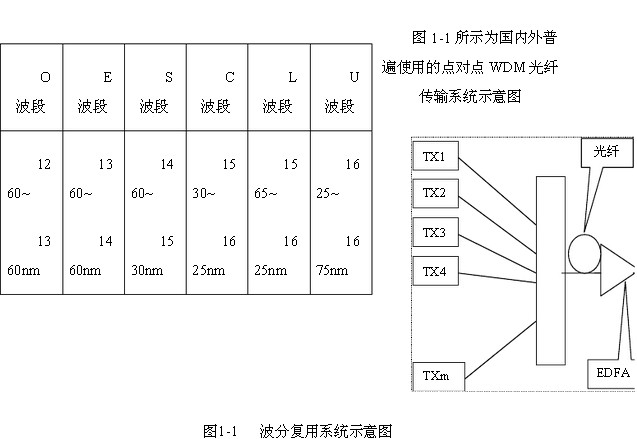 波分復(fù)用(WDM)技術(shù)是將兩種或多種不同波長的光載波信號在發(fā)送端經(jīng)復(fù)用器(亦稱合波器,Multiplexer)匯合在一起,并耦合到光線路的同一根光纖中進行傳輸?shù)募夹g(shù),在接收端,經(jīng)解復(fù)用器(亦稱分波器或稱去復(fù)用器,Demultiplexer)將各種波長的光載波分離,然后由光接收機作進一步處理以恢復(fù)原信號。這種在同一根光纖中同時傳輸兩個或多個不同波長光信號的技術(shù),稱為波分復(fù)用技術(shù)。所以WDM技術(shù)可以在不增加光纖纖芯的情況下使傳輸容量成倍的增加。特別是密集波分復(fù)用的應(yīng)用使光纖的傳輸容量進一步提高。原則上講,在光纖的低損耗窗口都可以進行波分復(fù)用,但由于目前EDFA帶寬平坦的范圍在1530nm~1565nm,所以當(dāng)前使用的復(fù)用波長大都在1550nm左右。ITU-T基于光纖的衰減譜對光纖的可用波段資源進行了詳細的劃分,如表1-1所示,所以當(dāng)前密集波分復(fù)用系統(tǒng)主要工作在C波段(1530nm~1565 nm)。