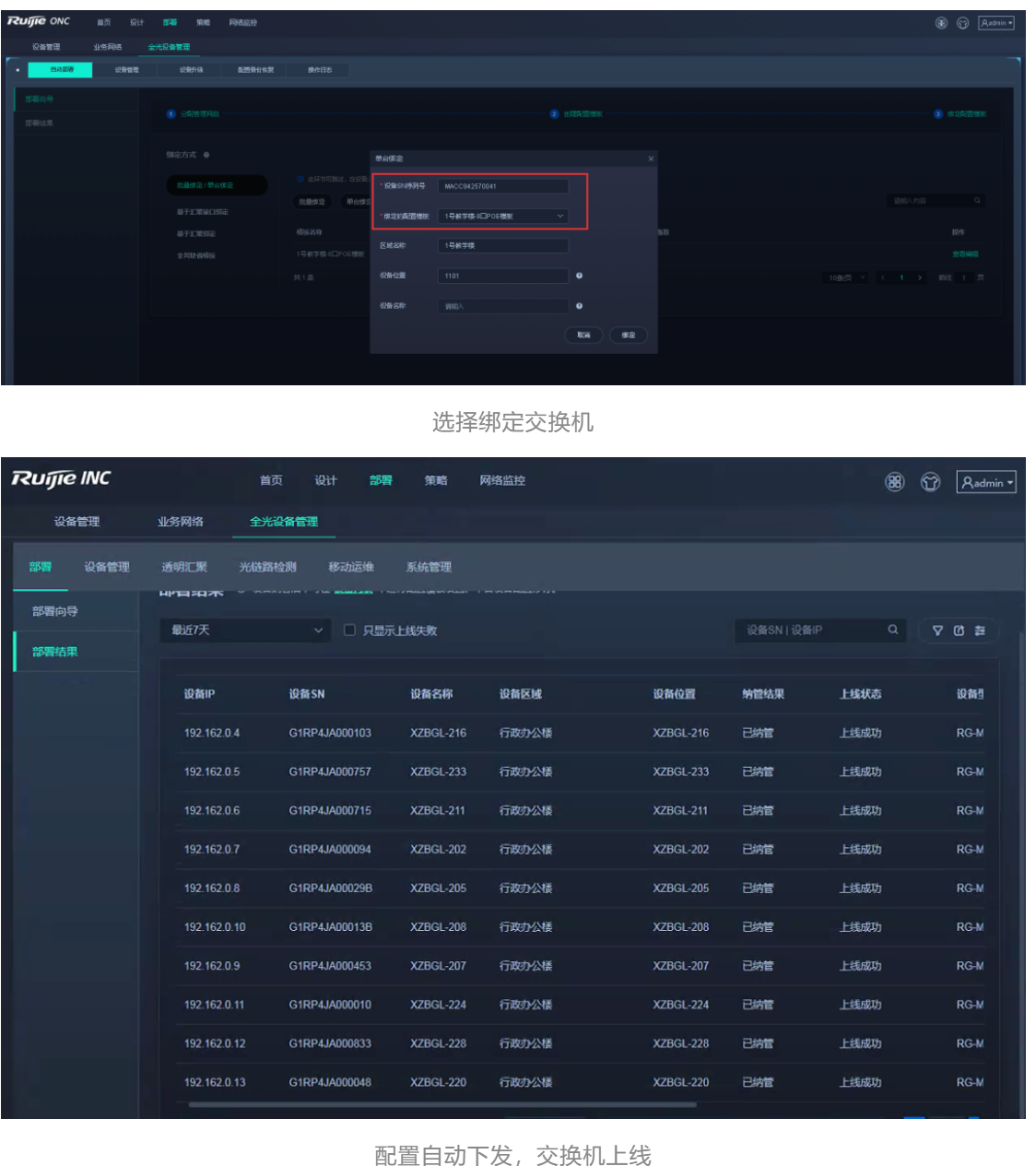 銳捷工程師提前在RG-INC平臺(tái)上做好配置文件,施工人員將設(shè)備接入光纖、上電,設(shè)備即可自動(dòng)完成注冊(cè)和配置。僅僅3步就完成了設(shè)備上線及網(wǎng)絡(luò)調(diào)通工作,設(shè)備零配置上線讓房間部署時(shí)間縮短到分鐘級(jí)。
