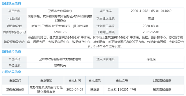 ICCSZ訊 近日,據河南省投資項目在線審批監(jiān)管平臺消息,新鄉(xiāng)衛(wèi)輝市大數據中心審批結果顯示“已批復”。該項目估算總投資32810.76萬元,位于新鄉(xiāng)市-衛(wèi)輝市-比干大道以東、振興路以南,總占地約35畝,建筑總面積約34462.61平方米,其中地上建筑面積14462.61平方米。包括:云計算中心、IDC數字機房、展示大廳、大數據應用中心、數據儲存中心、其他配套;地下建筑面積20000平方米。包括:地庫面積、會議室及辦公、機動車停車位等設施,計劃2021年12月完工。