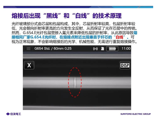 然而,在熔接點附近會出現(xiàn)垂直于纖芯的“黑線”或“白線”。光纖玻璃部分式由芯層和包層構(gòu)成,其中,芯層折射率較高,包層折射率較低,光會朝向折射率更高的方向發(fā)生全反射,從而保證了光在芯層中的傳輸。G.654.E光纖包層里摻入氟元素來降低包層的折射率,從此原因?qū)е?strong>當熔接相同廠家G.654.E光纖時,在熔接點附近出現(xiàn)垂直于纖芯的“白線”。可視為正?,F(xiàn)象,不會影響熔接后的光學(xué)、機械性能,無需進行重復(fù)熔接操作。