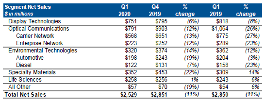ICC訊(編譯:Nina)美國紐約州康寧市,2020年4月28日--Corning公司(紐交所:GLW)公布了2020年第一季度財務業(yè)績。