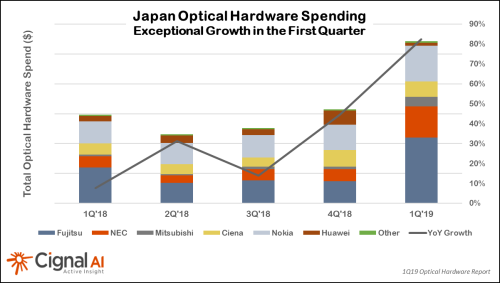 ICCSZ訊(編譯:Nina)根據Cignal AI最新的光網絡設備報告,2019年第一季度,日本光網絡設備開支同比增長82%,這是該市場光網絡設備支出連續(xù)第四個季度飆升。日本本土的光網絡設備供應商NEC、三菱和富士通,以及Ciena和諾基亞,都受益于日本市場開支增長,在該季度實現顯著增長。