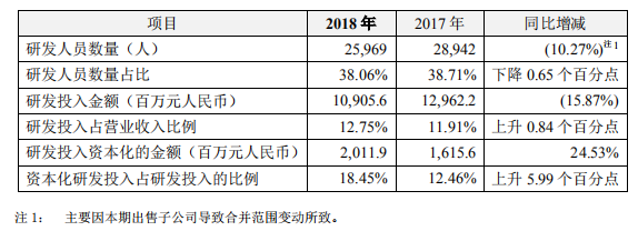 2018年,中興通訊研發(fā)投入金額109億元,同比下降15.87%;研發(fā)人數(shù)25969人,同比減少10.27%。