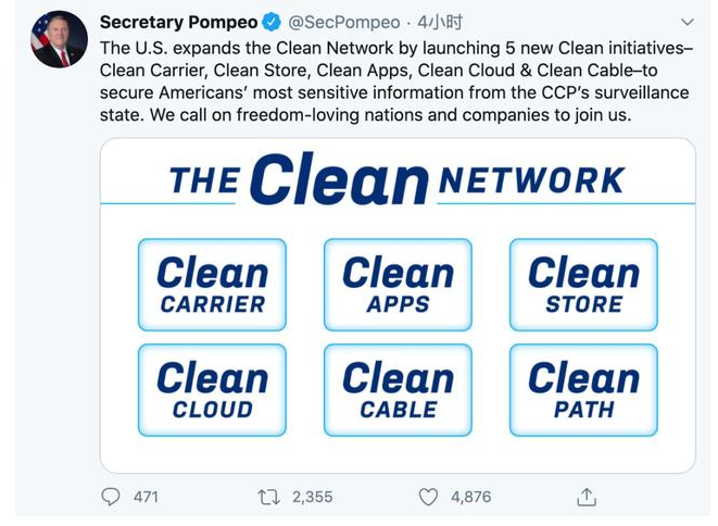 Pompeo 5日宣布,擴(kuò)大5G Clean Path計(jì)劃,推出干凈網(wǎng)絡(luò)(Clean Network)。Pompeo指出,這一計(jì)劃包括負(fù)責(zé)國際電信服務(wù)的運(yùn)營商、應(yīng)用商店、應(yīng)用程式(APP)、云端和海底電纜。