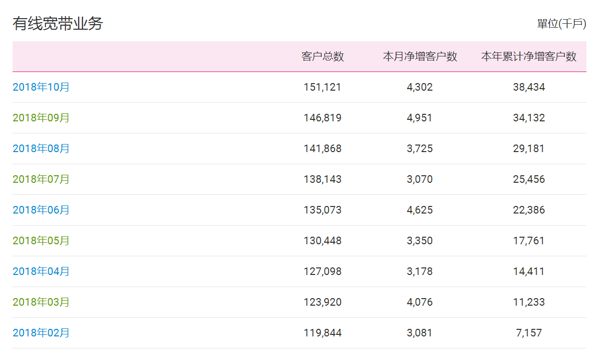 有線客戶總數(shù)達(dá)到1.51121億戶,本月凈增客戶數(shù)430.2萬(wàn)戶,本年累計(jì)凈增客戶數(shù)為3843.4萬(wàn)戶。