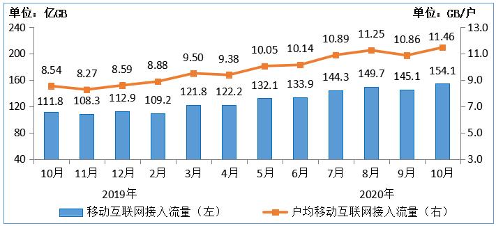 圖:2019-2020年1-10月移動(dòng)互聯(lián)網(wǎng)累計(jì)接入流量及增速情況