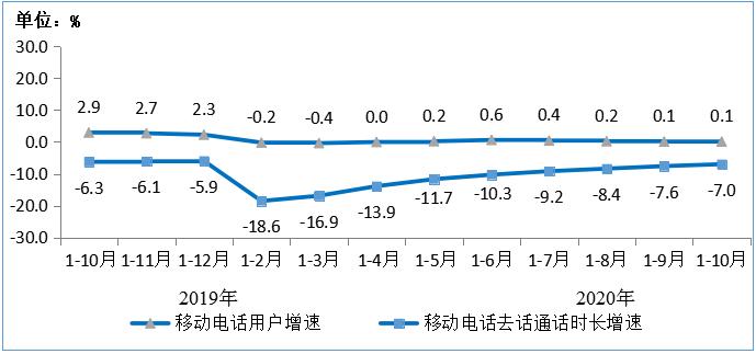圖:2019年-2020年1-10月移動(dòng)電話(huà)用戶(hù)增速和通話(huà)時(shí)長(zhǎng)增速