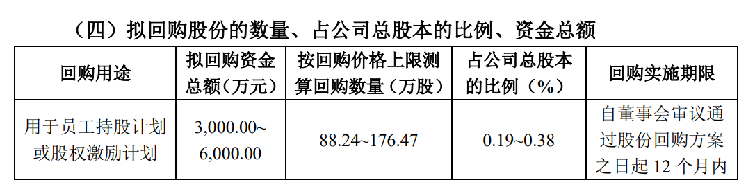 3、回購(gòu)股份的資金總額:不低于人民幣 3,000.00 萬(wàn)元,不超過(guò)人民幣6,000.00 萬(wàn)元;