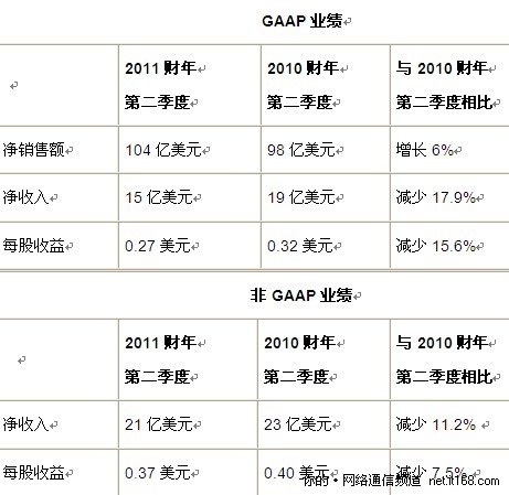 2011 財(cái)年前6個(gè)月凈銷售額為212億美元;相比之下2010 財(cái)年前6個(gè)月凈銷售額為188億美元。2011 財(cái)年前6個(gè)月凈收入按GAAP標(biāo)準(zhǔn)算為35億美元,合每股0.61美元;相比之下2010 財(cái)年前6個(gè)月凈收入按GAAP標(biāo)準(zhǔn)算為36億美元,合每股0.62美元。2011 財(cái)年前6個(gè)月非GAAP凈收入為 45億美元,合每股0.80美元;相比之下2010 財(cái)年前6個(gè)月非GAAP凈收入為45億美元,合每股0.76美元。