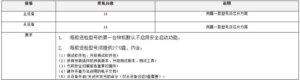 FTTR主設(shè)備和從設(shè)備應(yīng)同時提供樣品。如有不同芯片方案的產(chǎn)品應(yīng)各提供1款樣品進(jìn)行檢測,并標(biāo)明檢測順序。每款樣品的樣機(jī)數(shù)量及相關(guān)要求見下表: