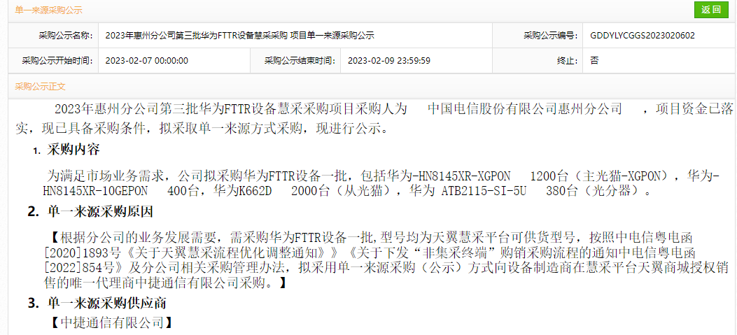 根據(jù)分公司的業(yè)務(wù)發(fā)展需要,需采購華為FTTR設(shè)備一批,型號均為天翼慧采平臺可供貨型號,按照中電信粵電函[2020]1893號《關(guān)于天翼慧采流程優(yōu)化調(diào)整通知》》《關(guān)于下發(fā)“非集采終端”購銷采購流程的通知中電信粵電函[2022]854號》及分公司相關(guān)采購管理辦法,擬采用單一來源采購(公示)方式向設(shè)備制造商在慧采平臺天翼商城授權(quán)銷售的唯一代理商中捷通信有限公司采購。