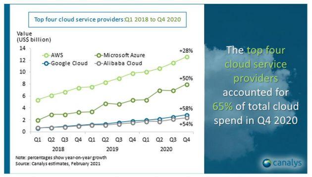 Canalys的數(shù)據(jù)顯示,排名第四的是阿里巴巴的云計(jì)算業(yè)務(wù)阿里云,它在全球云服務(wù)市場(chǎng)的份額為6%,它在2020年第四季度增長(zhǎng)54%。