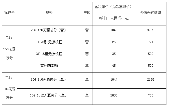 根據(jù)此前招標(biāo)公告顯示,該項(xiàng)目擬采購(gòu)無源波分設(shè)備共6646套,包括25G 1:6無源波分3725套,10G 1:6無源波分2158套,10G 1:12無源波分763套,另需采購(gòu)無源光纖復(fù)用設(shè)備配件2500套。該項(xiàng)目分為2個(gè)標(biāo)包,每個(gè)標(biāo)包確定1個(gè)中標(biāo)人,份額100%。2個(gè)標(biāo)包采購(gòu)內(nèi)容具體劃分如下圖: