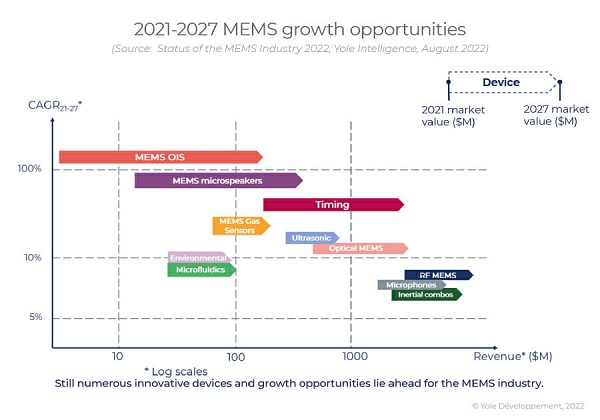 主要增長來自傳統(tǒng)MEMS器件(麥克風(fēng)、射頻、慣性、光學(xué)),這些器件應(yīng)用于可穿戴設(shè)備和可聽設(shè)備(尤其是傳感器封裝的TWS)、5G智能手機(jī)、ADAS、工業(yè)監(jiān)控等眾多應(yīng)用領(lǐng)域。盡管如此,新興器件(目前市場較?。┑奈磥戆l(fā)展前景廣闊,如用于空氣質(zhì)量監(jiān)測的氣體傳感器和用于觸覺和醫(yī)學(xué)成像的超聲波MEMS,以及目前市場上正在大肆宣傳的MEMS定時(shí)/振蕩器和微型揚(yáng)聲器。這兩種技術(shù)都有潛力取代幾十年前的技術(shù),而且它們正在朝著這個(gè)方向前進(jìn)。