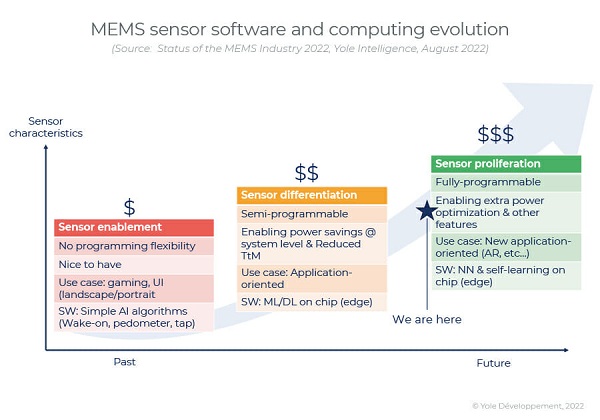 MEMS傳感器制造商正試圖擺脫產(chǎn)品商品化周期,通過為MEMS傳感器添加軟件、處理和計(jì)算能力,為其提供額外的功能和附加值,從而向價(jià)值鏈上游邁進(jìn)。顯然,主要MEMS制造商正在形成一條路徑,其方法包括預(yù)處理和傳感器融合(TDK Invensense、Bosch、STMicroelectronics、Melexis等)以及邊緣/邊緣的AI/ML/DL(Bosch、STMicroelectronics,Aspinity w/Infineon、Syntiant w/Infineon等)。相關(guān)產(chǎn)品包括STMicroonics的ISPU、Bosch的BHI260AP和BME688等…...