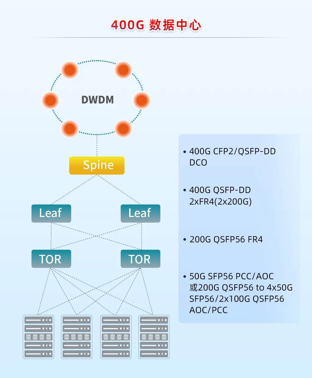 新推出的400G QSFP-DD 2×FR4與以往的400G QSFP-DD FR4的主要不同點(diǎn)在于:400G 2×FR4光口支持8×50G PAM4,而400G FR4光口為4×100G PAM4;400G QSFP-DD 2×FR4還具備組網(wǎng)優(yōu)勢,它采用2×Dual LC光接口,支持扇出兩個200G QSFP56光模塊,可完成200G數(shù)據(jù)中心朝向400G數(shù)據(jù)中心的直接躍遷。其組網(wǎng)架構(gòu)如下: