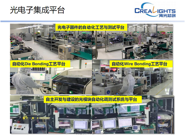 綜合多種光電子集成平臺類型特點,海光芯創(chuàng)打造出一條從光電子器件到光模塊垂直整合體系,即高速光電子集成IDM平臺,其具備芯片級評估能力,器件到模塊的設(shè)計與仿真,自動化工藝與測試平臺和系統(tǒng)應(yīng)用級測試分析。其中,芯片級評估能力涵蓋了光芯片老化、光芯片測試、光芯片可靠性分析、光芯片失效分析等;在設(shè)計與仿真方面,新平臺具備了光學(xué)設(shè)計與仿真、器件級3D-strcture高頻設(shè)計與仿真、高頻電路和信號完整性設(shè)計等能力;在工藝平臺方面,新平臺部署了可批量生產(chǎn)的自動化工藝機(jī)臺,可完成高精度、高可靠性和Die Bonding、Wire bonding和光耦合工序。