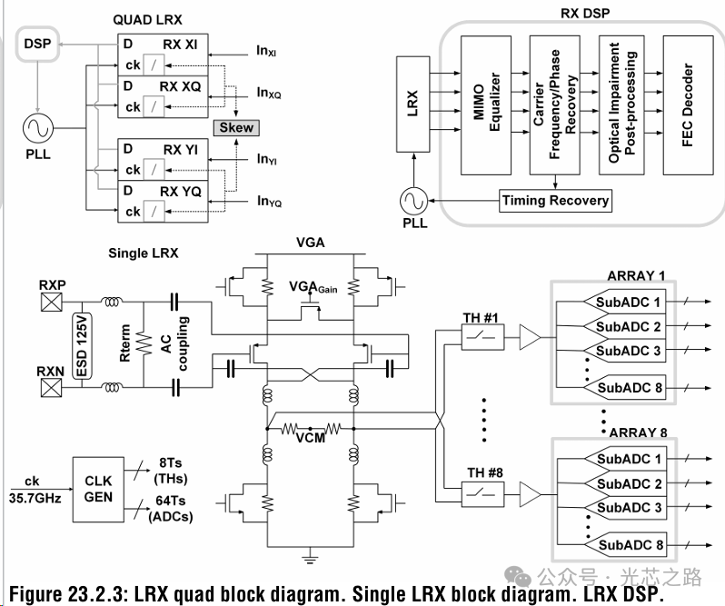 LRX架構(gòu)如下所示,使用 8/7 倍采樣比率和半速率 35.7GHz 時鐘運行,其設計可實現(xiàn)高達 30GHz,SNDR超過32dB。