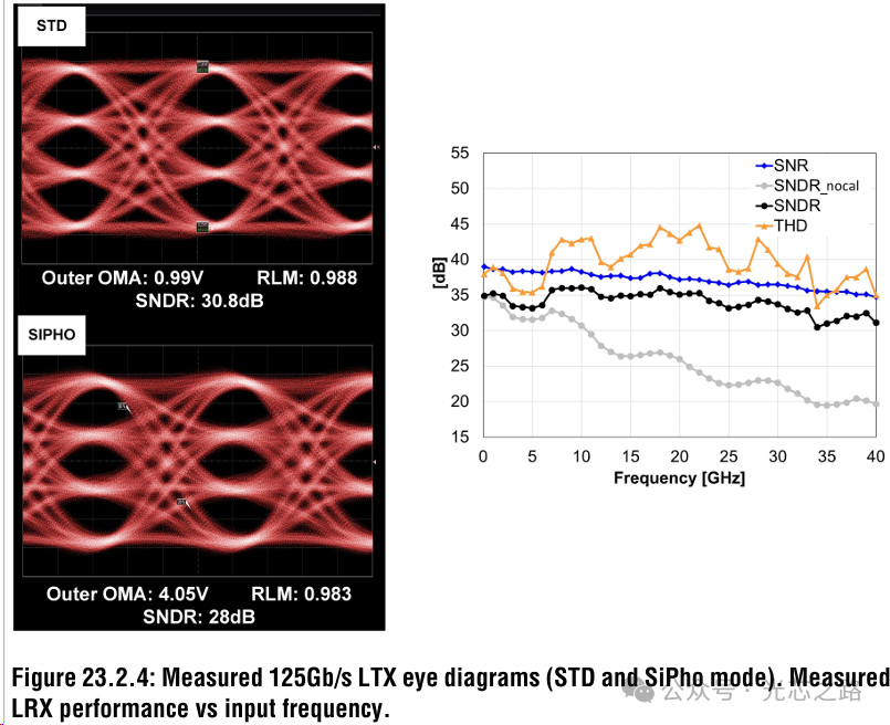 下圖展示LTX 通道在標準模式和 SiPho 模式下的 125Gb/s PAM4 眼圖,經(jīng)過處理后的信噪比/帶寬分別為 30.8dB/31GHz 和 28dB/35GHz,TX 路徑的隨機抖動測量值均為 120fsrms。
