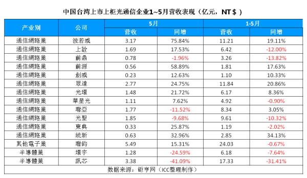 摘要:據(jù)ICC統(tǒng)計(jì)數(shù)據(jù)顯示,15家臺(tái)灣上市/上柜光通信企業(yè)5月合并營(yíng)收總和為26.5億元(新臺(tái)幣,下同),同比增長(zhǎng)2%;1~5月合并營(yíng)收116.3億元,同比下滑5%,降幅進(jìn)一步縮窄。表現(xiàn)亮眼的企業(yè)包括波若威、眾達(dá)和統(tǒng)新等,前五月?tīng)I(yíng)收同比增幅達(dá)到19%、21%和34%。