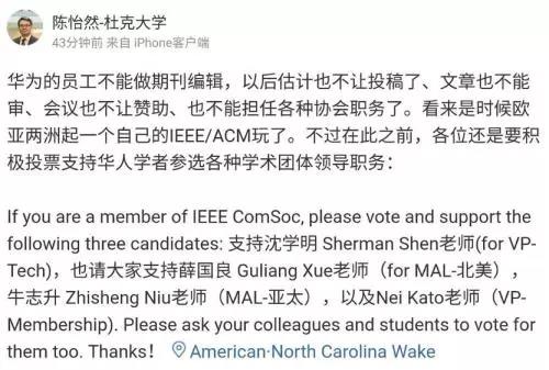 其實,華為贊助了不少IEEE的活動,現(xiàn)在看來好像還是允許華為繼續(xù)贊助的,也允許華為的人投稿,但是就是不允許你審稿。然后,論文錄用以前的活動是不能參加的,但論文發(fā)表以后,比如華為的人要繼續(xù)做一些支持,或者做一些公開的討論都是可以的,但是好像是私下的討論,就是那種閉門會議是不允許的。