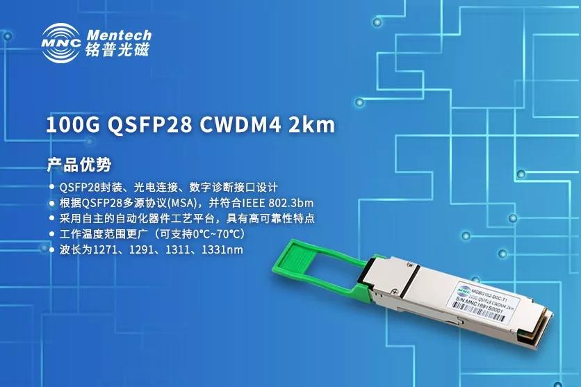銘普光磁的100G QSFP28 CWDM4將四個發(fā)射器和接收器集成到一個模塊中。在發(fā)射機端,通過集成的光學(xué)多路復(fù)用器將四個波長合成在一起。在接收端,光數(shù)據(jù)通道的用集成光學(xué)解復(fù)用器進行解復(fù)用。每個數(shù)據(jù)通道集成光電探測器和跨阻抗放大器,CDR。