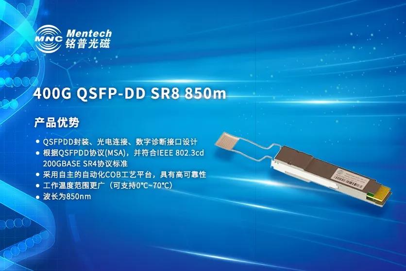 銘普光磁的400G QSFPDD SR8將8個發(fā)射器和8個接收器集成到一個模塊中,每個通道25Gbd,并采用PAM4調(diào)制格式,調(diào)制成50Gb/s,目前已有DSP和CDR兩種不同方案。