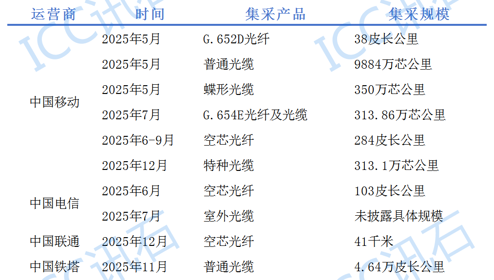 ICC訊 轉(zhuǎn)眼就到2025年末,行業(yè)進入到了年度總結(jié)與規(guī)劃期。2025年,我國三大運營商及鐵塔公司在光纖光纜領(lǐng)域的集采活動呈現(xiàn)出"規(guī)模穩(wěn)健、技術(shù)分化、創(chuàng)新加速"的鮮明特征。2025年國內(nèi)普通光纜的需求處于疲軟下滑的趨勢,而對新型光纖需求大增??招竟饫w成為中國移動、中國電信、中國聯(lián)通共同布局重點,據(jù)ICC不完全統(tǒng)計,2025年三大運營商對空芯光纖的集采總量超400皮長公里,凸顯了對下一代低時延、大容量技術(shù)的探索。