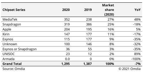 圖:根據(jù)Omdia追蹤芯片出貨量的最新《智能手機(jī)模型市場(chǎng)跟蹤報(bào)告》,聯(lián)發(fā)科在2020年引領(lǐng)了全球智能手機(jī)芯片市場(chǎng)。