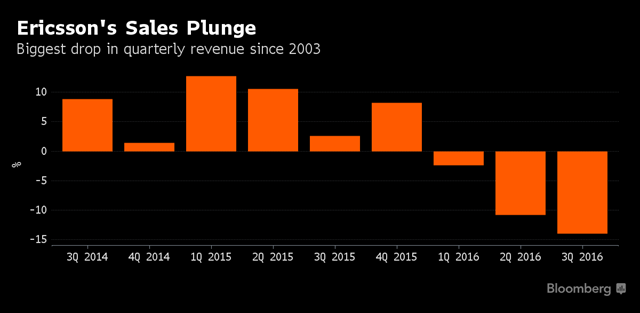 愛立信表示,從2016年上半年開始行業(yè)趨勢持續(xù)萎靡,行業(yè)對移動寬帶的需求愈發(fā)減少,尤其是在那些宏觀經(jīng)濟環(huán)境疲軟的市場,這樣的整體疲軟狀態(tài)正在加速。并且,愛立信預期這樣的趨勢在短期內(nèi)仍將持續(xù)。
