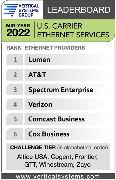 在排行榜上,在 Lumen 之后,AT&T 排名第二,其次是 Spectrum Enterprise、Verizon、Comcast Business 和 Cox Business。上榜服務(wù)提供商要求在美國(guó)零售以太網(wǎng)服務(wù)市場(chǎng)上至少占有 4% 的份額。