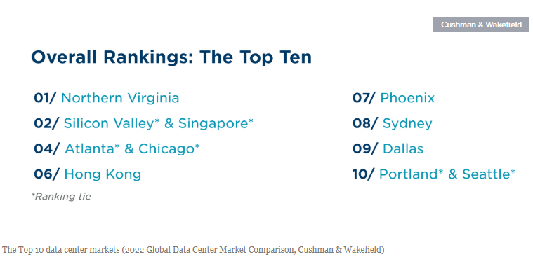 (彭博社報道) — 根據(jù)全球房地產(chǎn)公司戴德梁行(Cushman & Wakefield)的一份2022年年度報告,北弗吉尼亞連續(xù)第三年被評為全球最理想的數(shù)據(jù)中心地點。新加坡與硅谷并列第二,去年排在第五位。
