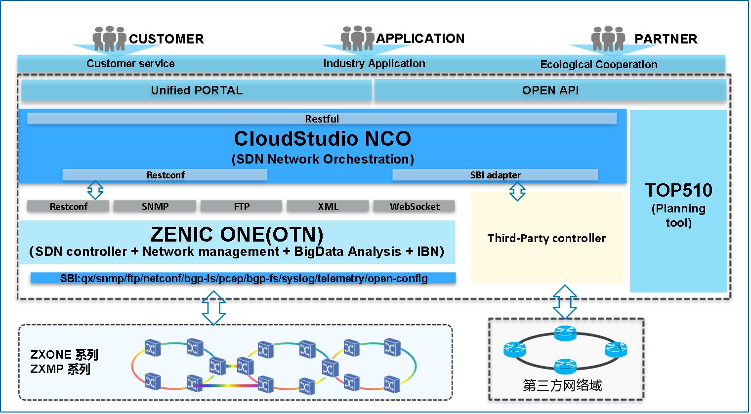 中興通訊智能化OTN產(chǎn)品體系包括ZXONE系列和ZXMP系列轉(zhuǎn)發(fā)層產(chǎn)品、ZENIC ONE (OTN)管控系統(tǒng)、CloudStudio NCO編排協(xié)同系統(tǒng)以及規(guī)劃工具Top510,簡(jiǎn)化超100G部署,實(shí)現(xiàn)“端到端”全場(chǎng)景覆蓋以及全業(yè)務(wù)承載,構(gòu)建具備超寬傳輸、靈活承載、智能管控特性的全光網(wǎng)絡(luò)。