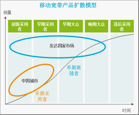 移動寬帶業(yè)務(wù)被引入市場已經(jīng)有一段時間,用戶對該業(yè)務(wù)有了一定的認(rèn)知和使用,因此,產(chǎn)品的使用者既包含早期采用者也有大眾用戶。而在中國,
