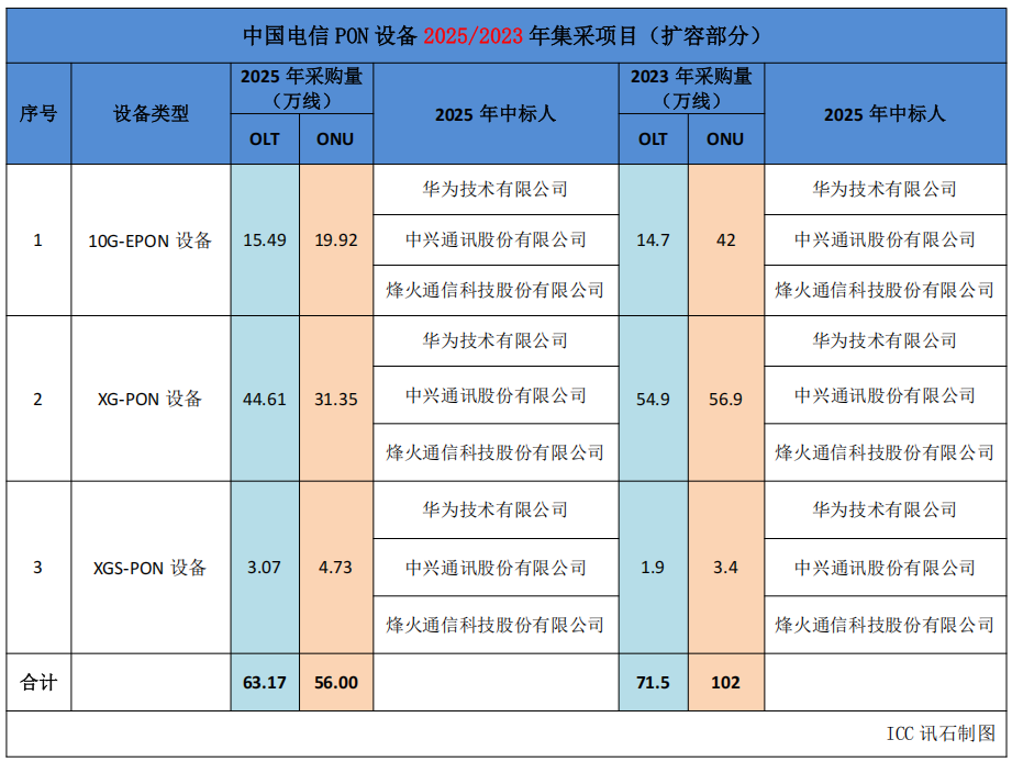 ICC訊 1月23日,中國電信公布2025年P(guān)ON設(shè)備集中采購項(xiàng)目(擴(kuò)容部分),共采購10G-EPON設(shè)備(OLT 15.49+ONU 19.92)35.41萬線,XG-PON設(shè)備(OLT 44.61+ONU 31.35)75.96萬線,XGS-PON設(shè)備(OLT 3.07+ONU 4.73)7.8萬線;中標(biāo)人均為華為、中興、烽火三家。