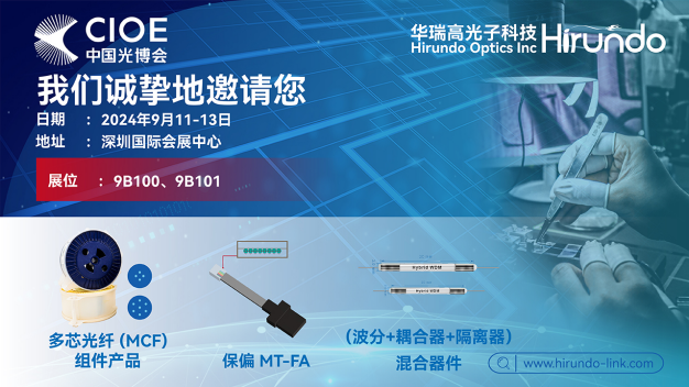 第二十五屆中國國際光電博覽會(CIOE)將于2024年9月11-13日在深圳國際會展中心舉辦。華瑞高將攜多種類型光纖FBT 耦合器(保偏、多芯、單模、多模),混合器件、激光器、多芯光纖方案等在(9號館)9B100、9B101展臺展出,歡迎您與我們的工程師討論。