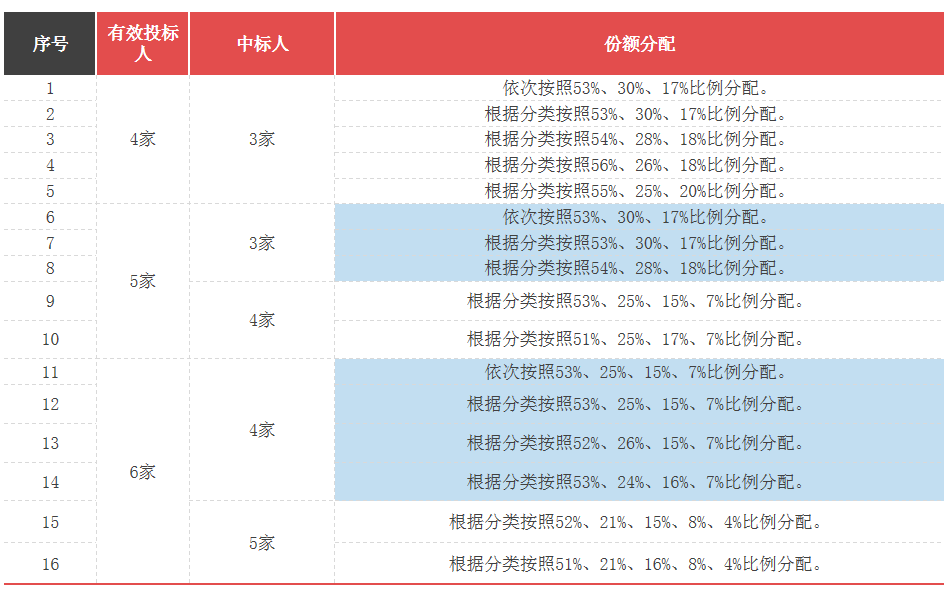 根據(jù)供應(yīng)商綜合實力,進行供應(yīng)商分類;在此基礎(chǔ)上,按照有效投標人數(shù)量、分類綜合得分排序,確定中標人及動態(tài)份額分配。