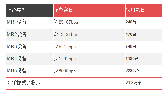 根據(jù)中國聯(lián)通3月4日的招標公告顯示,本次項目為集中招標內(nèi)容為:(1)采購核心匯聚設(shè)備整機部分4920臺,其中:MR1設(shè)備 240臺(設(shè)備容量≥25.6Tbps),MR2設(shè)備 470臺(設(shè)備容量≥12.8Tbps),MR3 設(shè)備740臺(設(shè)備容量≥6.4Tbps),MR4 設(shè)備1190臺(設(shè)備容量≥1.6Tbps),MR5設(shè)備2280臺(設(shè)備容量≥800Gbps);(2)采購可插拔式光模塊21.8萬個。