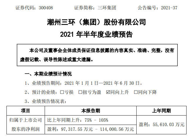 ICC訊 (編輯:Nicole) 潮州三環(huán)(集團(tuán))股份有限公司(以下簡稱“三環(huán)集團(tuán)”或“公司”)發(fā)布2021 年半年度業(yè)績預(yù)告:預(yù)計(jì)業(yè)績同向上升,歸屬于上市公司股東的凈利潤97,317.55 萬元 - 114,000.56 萬元,同比增長75% - 105%,上年同期實(shí)現(xiàn)盈利55,610.03 萬元。