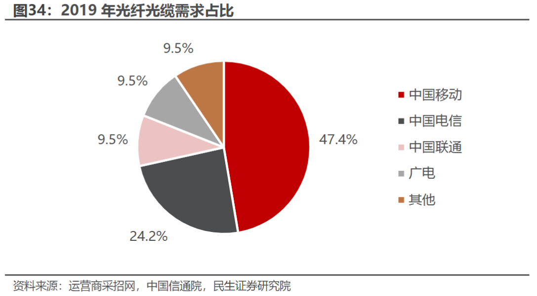 民生證券分析師馬天詣8月24日發(fā)布的研報指出,光纖下游應用場景主要為電信市場和數據中心場景,三大運營商為主要下游客戶。在通信產業(yè)鏈中,運營商是光纜行業(yè)的主要下游客戶,2019年三大運營商需求量占比達81%,其中中國移動承擔國內近一半需求。
