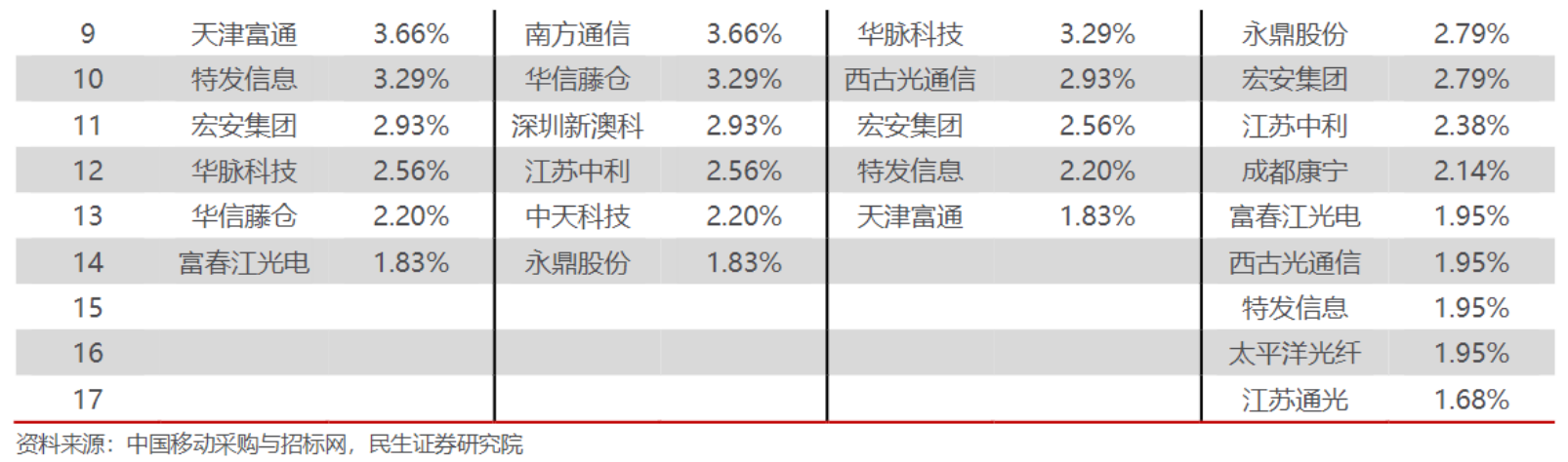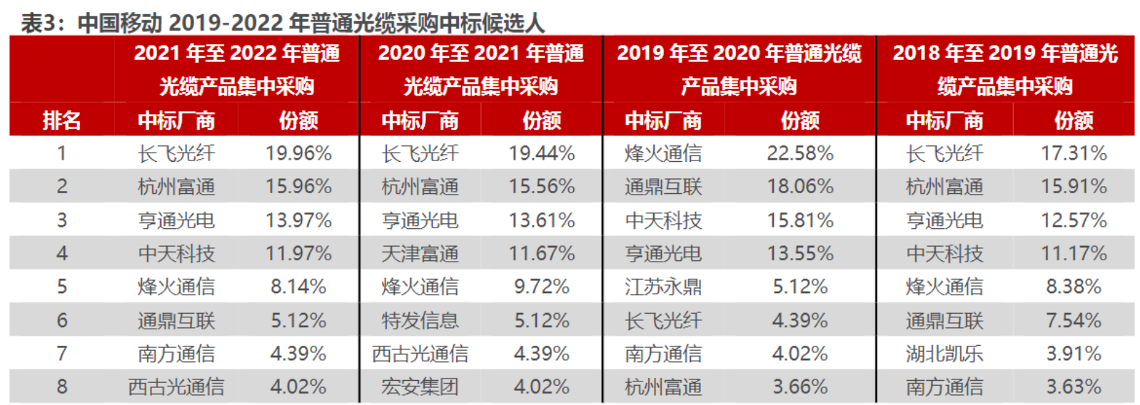 以2018-2022年中國移動普通光纜集采項目為例,除2019年外,長飛光纖中標份額一直保持首位,亨通廣電、中天科技、烽火通信、通鼎互聯和特發(fā)信息等A股上市公司在集采中也保持較高份額。