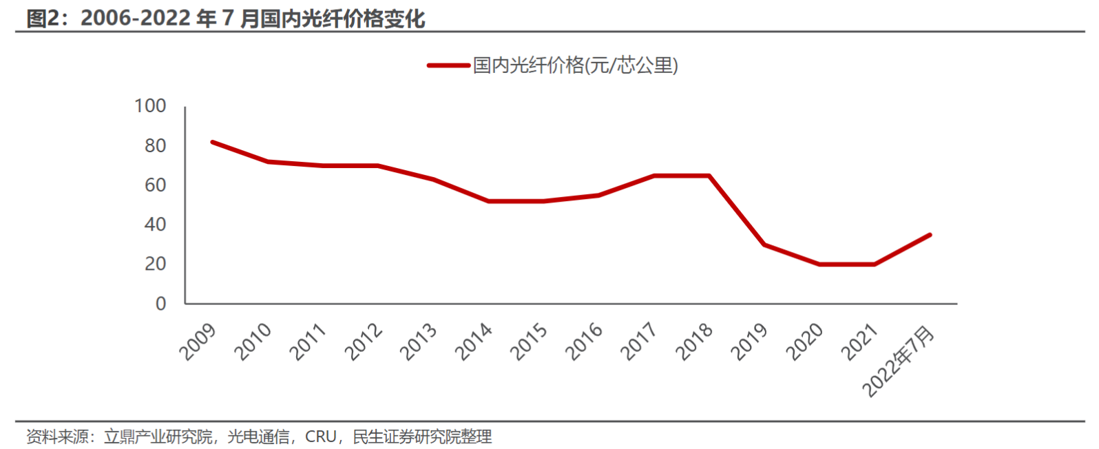 數據顯示,22年1-7月國內光纜產量累計為1.99億芯公里,累計同比增長19%,22年至今增速顯著高于同期,以單月數據來看,22年7月光纜產量為3275.4萬芯公里,同比增長25%。此外,在F5G和東數西算等需求帶動下,22年需求量也大幅提升,驗證國內光纖光纜行業(yè)景氣抬升。