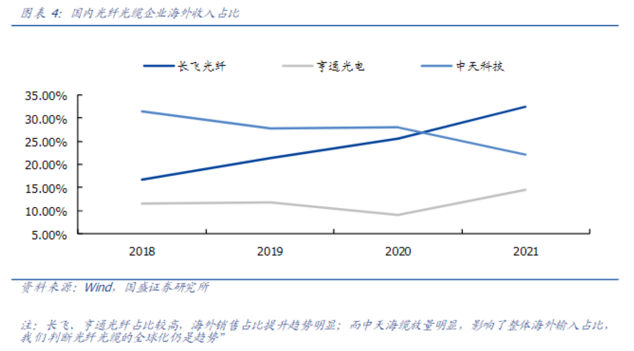 國盛證券分析師宋嘉吉8月28日的研報指出,在過去幾年國內需求放緩的情況下,光纖光纜企業(yè)在高毛利海外市場加速拓張,助其從集采的行業(yè)低谷中復蘇。以行業(yè)龍頭長飛光纖為例,公司海外業(yè)務占比從2018年的16.6%上升到2021年的32.4%。民生證券指出,受制于經濟性,判斷海外龍頭如康寧、古河短期不會大規(guī)模擴產,海外將保持較為良性的供需格局。