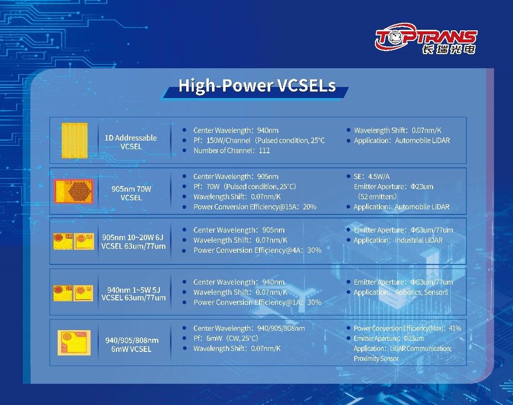 在消費(fèi)電子和汽車兩大終端產(chǎn)品的智能化需求之下,VCSEL芯片在工業(yè)傳感等領(lǐng)域迎來更加龐大的市場(chǎng)需求。得益于長(zhǎng)期產(chǎn)品開發(fā)的經(jīng)驗(yàn),長(zhǎng)瑞已經(jīng)開拓了更加豐富的VCSEL芯片產(chǎn)品線。目前,長(zhǎng)瑞光電VCSEL芯片產(chǎn)品現(xiàn)已涵蓋8xx-9xx多個(gè)波長(zhǎng)、單結(jié)和多結(jié)、6mW-70W等不同功率VCSEL芯片。產(chǎn)品形態(tài)包括:?jiǎn)吸c(diǎn)、陣列、可尋址等;支持VCSEL SMD、TO等封裝系列,滿足工業(yè)傳感市場(chǎng)多樣化的產(chǎn)品需求。