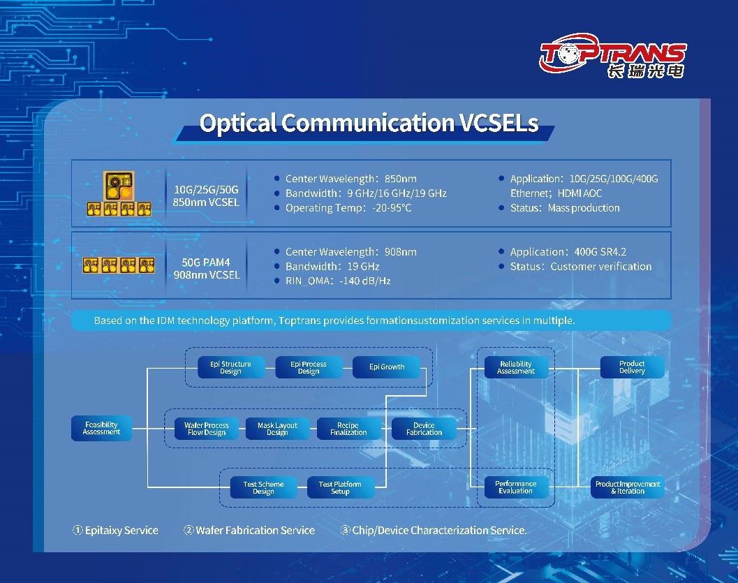 長(zhǎng)瑞依靠不斷優(yōu)化的研發(fā)流程及工藝流程,能夠根據(jù)客戶的應(yīng)用需求設(shè)計(jì)VCSEL定制化開發(fā)方案,能夠在1-2個(gè)月內(nèi)基于客戶需求提供定制化樣品,努力為客戶提供成本優(yōu)化方案及更高的技術(shù)附加值。