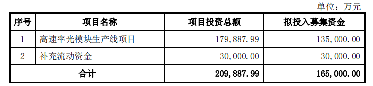 根據(jù)募集說明書顯示,項目擬募集16.5億元,其中13.5億元用于投入高速率光模塊生產(chǎn)線項目,3億元用于補充流動資金。公告預計高速率光模塊項目總投資18億元,其中本次非公開發(fā)行股票募集資金擬投入13.5億元,不足部分將由公司通過自籌方式解決。