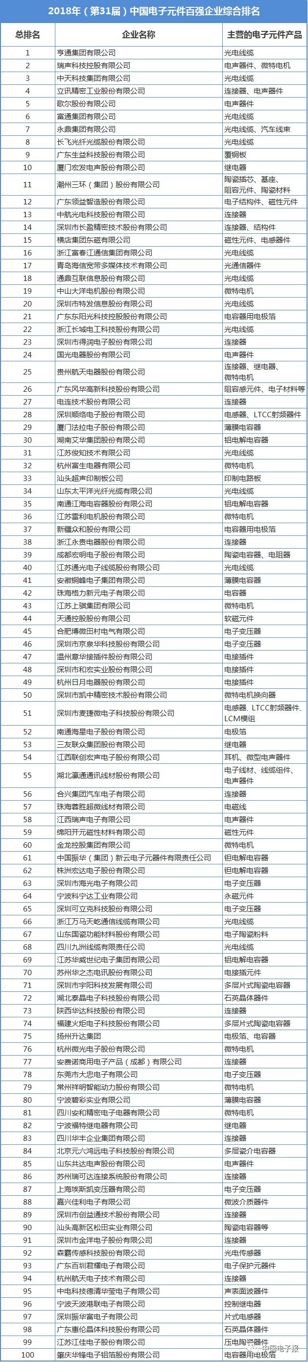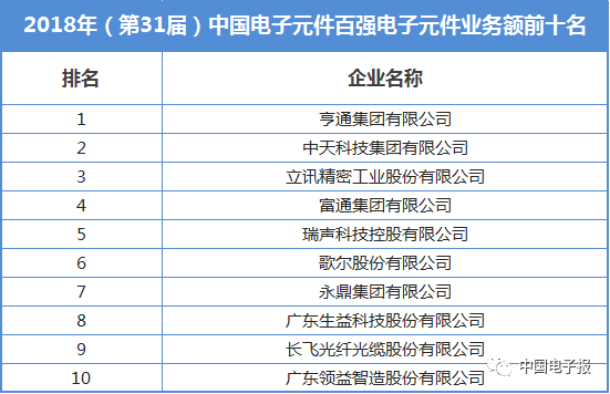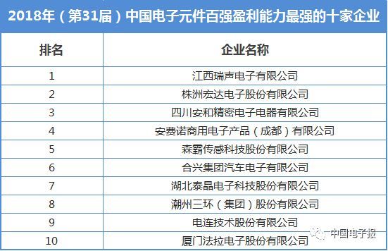 在中國電子元件重點骨干企業(yè)的支持與協助下,中國電子元件行業(yè)協會信息中心經過歷時4個月努力,2018年(第31屆)中國電子元件百強企業(yè)排序工作圓滿完成,100家在規(guī)模實力、財務狀況、研發(fā)能力等方面表現優(yōu)異的中國電子元件骨干企業(yè)入選新一屆中國電子元件百強。